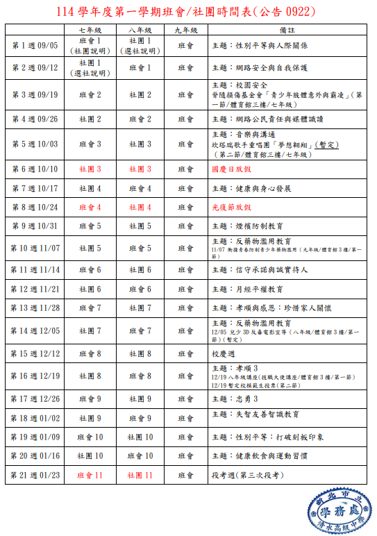 114學年度國中部社團/班會時間表